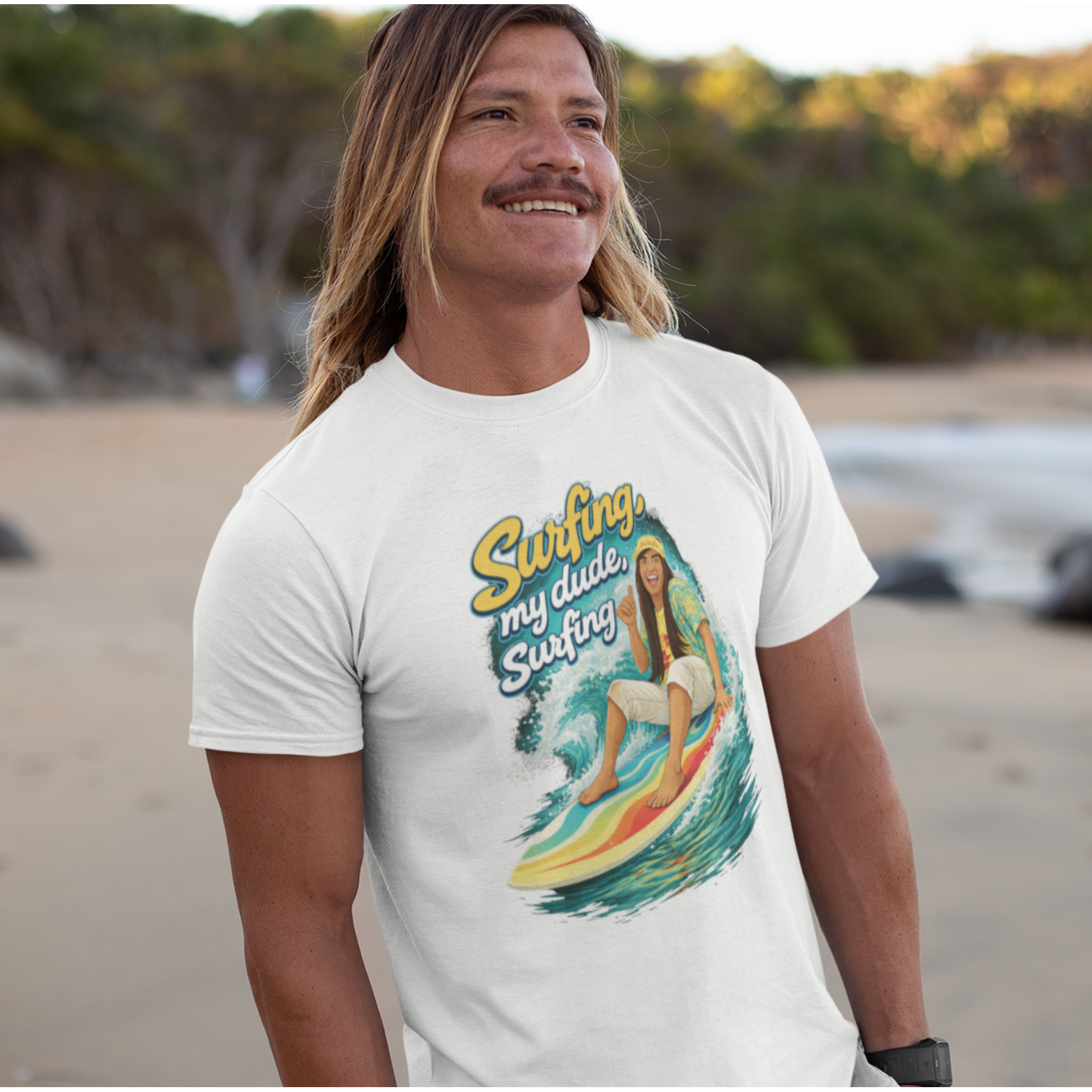 Surfing, my dude stands for lightness, joy, and that perfect moment when everything feels right. Sun on your face, board beneath your feet, and a smile that says: life’s good.
